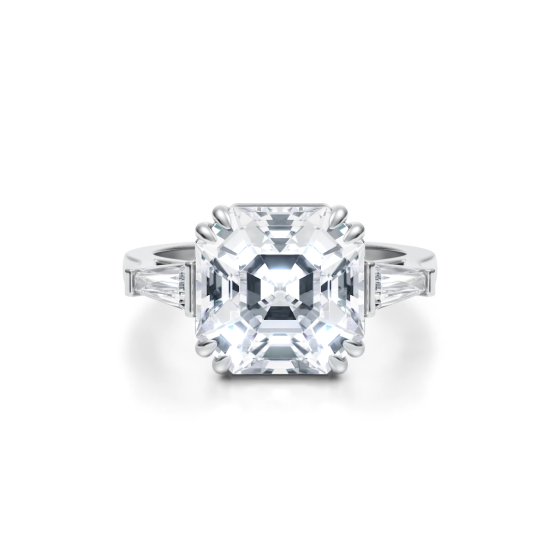 Flanking the center stone are elegant tapered baguette side diamonds, adding symmetry and refinement while drawing the eye toward the Asscher’s bold geometry. This side-stone detail enhances the ring’s clean architectural lines, creating a look of understated luxury and timeless sophistication.
