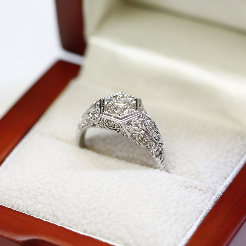 Our vintage engagement rings are crafted with meticulous attention to detail for a refined and enduring charm. Personalize your ring by selecting your preferred diamond shape, metal type, and vintage elements such as filigree or milgrain detailing. Whether you choose a classic design from our collection or a custom piece, every ring is made to order with the utmost care.