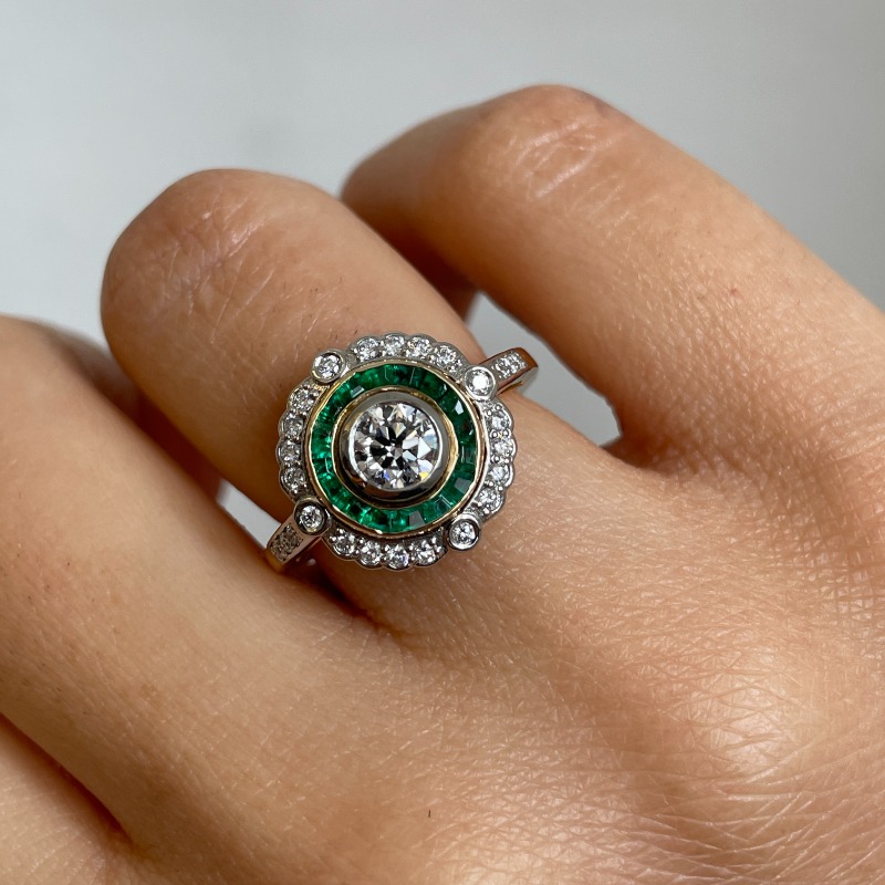 The bespoke Jolene art deco design combines a sparkling lab grown round cut diamond held in a rubover setting, surrounded by a halo of Emeralds, and completed with a larger halo of round cut diamonds in a subtle shoulder set band. A mesmerizing design that will get heads to turn. The ring can be crafted in either 18k white gold, 18k yellow gold, 18k rose gold or platinum and is available to be custom ordered with a center 0.30ct up to 10t certificated lab grown round shape diamond. All of our jewelry is designed and manufactured in the United States.